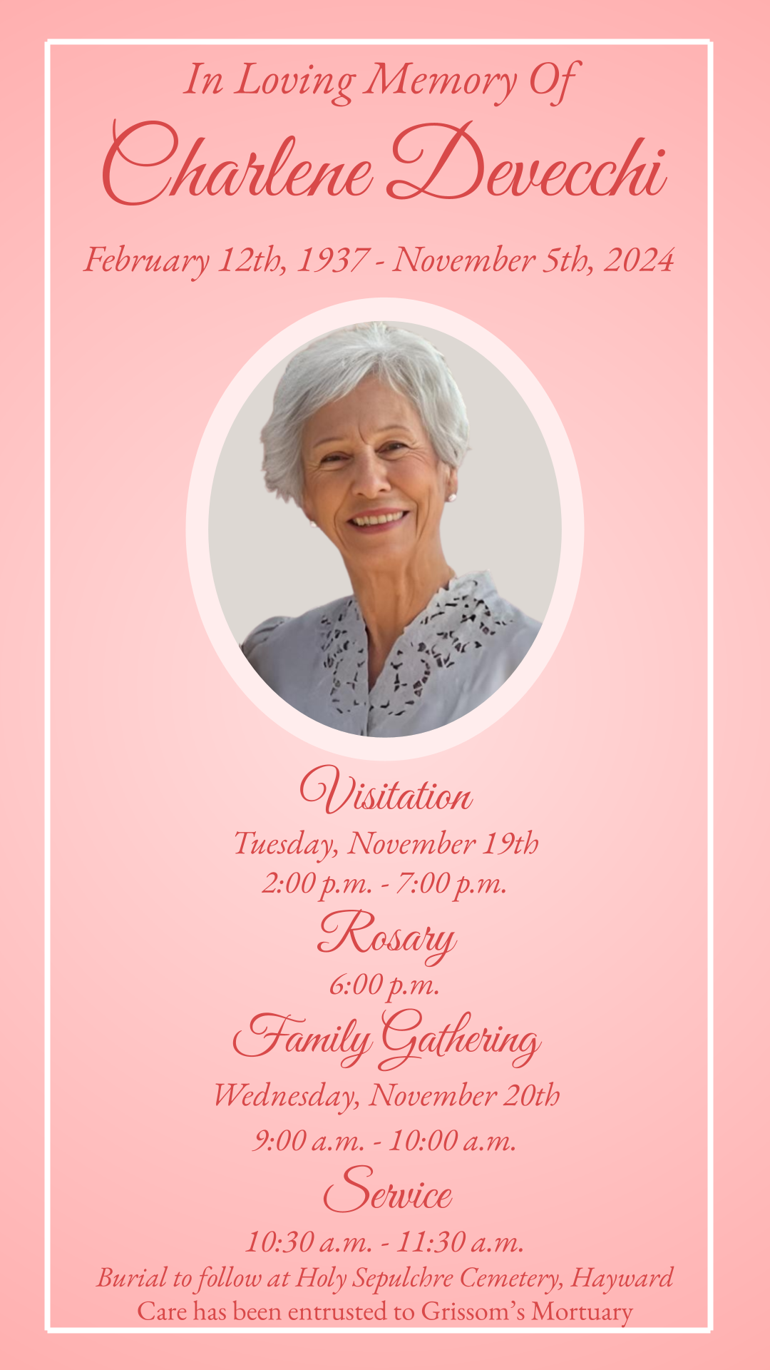 Charlene Devecchi entered into rest on November 5th, 2024 at the age of 87 years old.