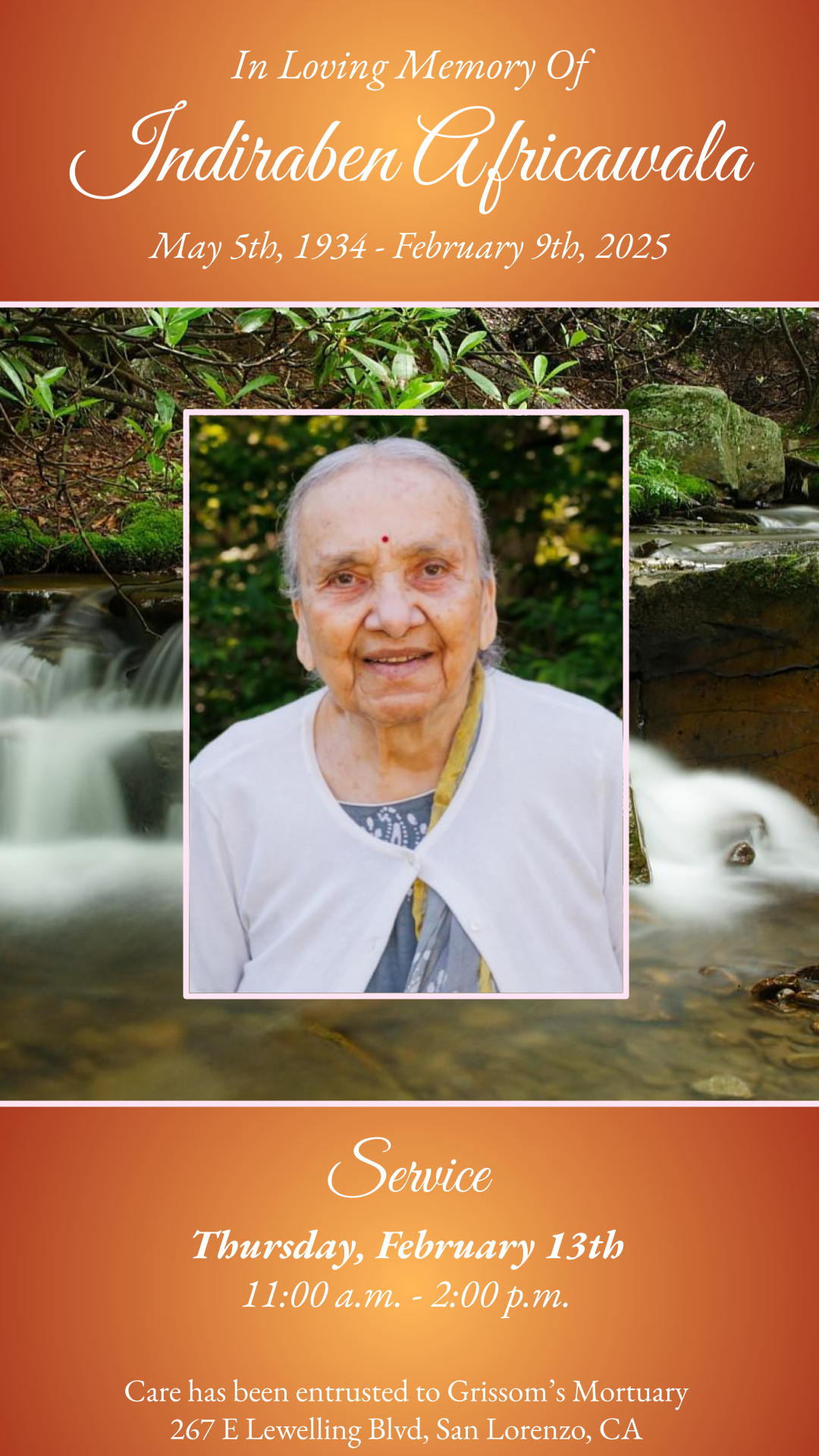 Indiraben Africawala has entered into rest on February 9th, 2025.