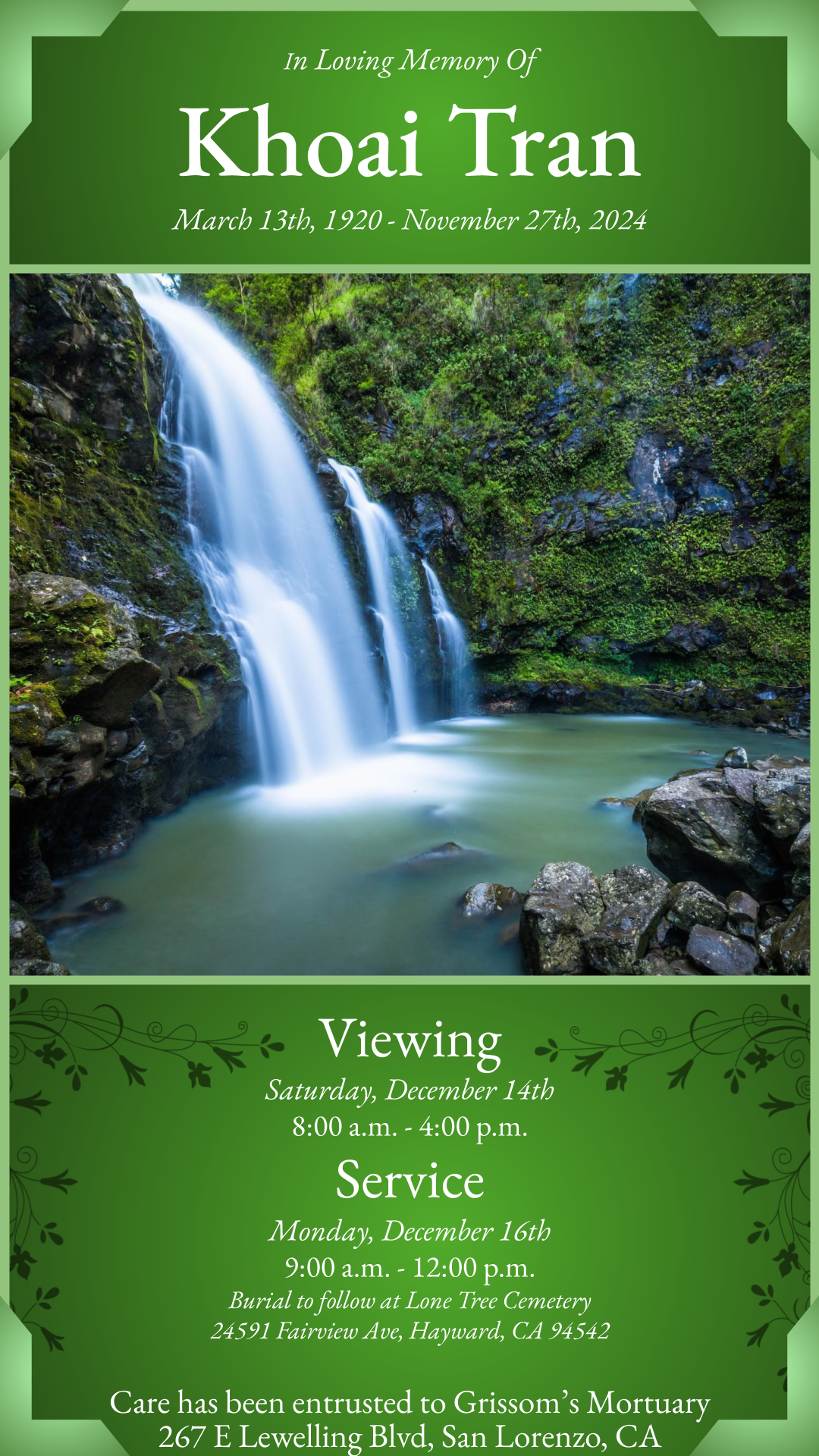 Khoai Tran has entered into rest on November 27th, 2024.