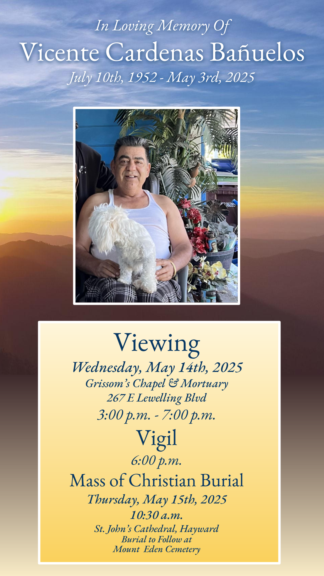 Vicente Cardenas Bañuelos entered into rest on May 3rd, 2025.